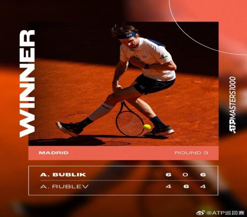 体育资讯4月27日报道宣称 网球ATP1000马德里大师赛男单第三轮,布勃里克淘汰卢布列夫。