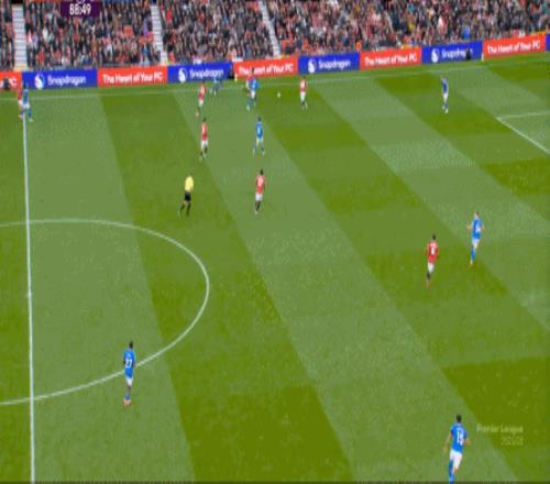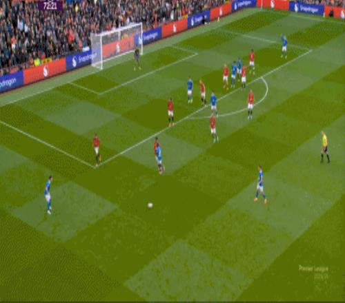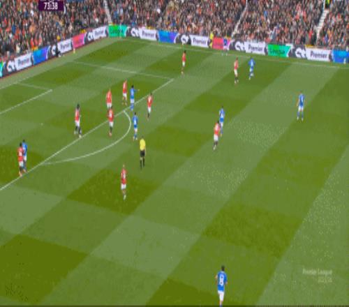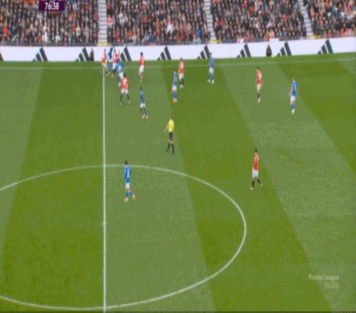 所以在这短短的几分钟里,你就可以看到曼联在攻防两端的效率问题了,但在这一点之外,也应该预判到点位上如果布置了不同的球员,这些攻防表现可能会发生什么样的变化,也可以看到阿莫林的343体系在利用什么空间和优势,具体在打什么东西。