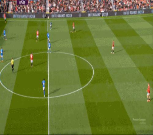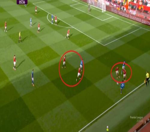 比如这个右路的4防3,达洛特和卢克-肖两人扑一点,布鲁诺和芒特都没有注意到身后空间: