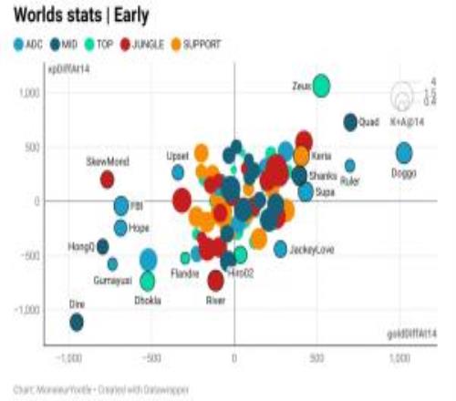 体育资讯10月21日报道宣称 外媒发布截至目前世界赛前14分钟经济差与经验差数据图(其中横坐标代表经济差,纵坐标代表经验差,图中圆圈大小代表14分钟的击杀与助攻数的平均值,以4、1.5、0.4为节点):Zeus经验差最高;Doggo经济差最高。
