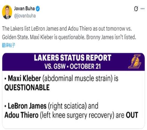 由于遭遇坐骨神经痛的困扰,詹姆斯只能进行个人训练,无法参加合练且确定缺席揭幕战,湖人官方已经公布明日揭幕战对阵勇士的伤病报告,克勒贝尔(腹肌拉伤)出战成疑,50%出战可能性;詹姆斯(右侧坐骨神经痛)和阿杜-蒂耶罗(左膝手术恢复)都因伤缺席比赛。