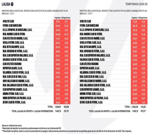 西甲联盟近日公布了2024-25赛季的电视转播收入分配数据。本赛季联赛该项总收入为12.92亿欧元,其中皇家马德里以约1.579亿欧元成为收入最高的俱乐部,巴塞罗那以约1.564亿欧元紧