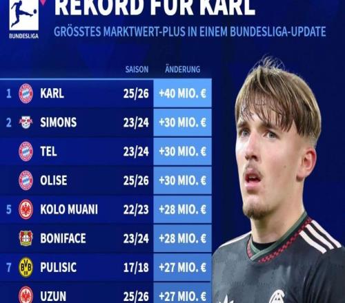 北京时间12月19日,德转更新了德甲球员的身价,拜仁慕尼黑17岁新星伦纳特-卡尔身价暴涨4000万欧元,从2000万欧元跃升至6000万欧元。根据德转官方的统计,伦纳特-卡尔也就此成为了自