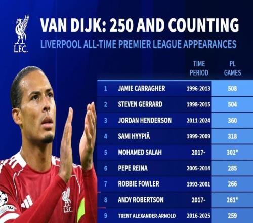 北京时间12月14日,在英超第16轮利物浦主场2-0击败布莱顿的比赛中,红军队长范戴克迎来了自己代表俱乐部在英超出场250场比赛的里程碑,与此同时,德转也列出了利物浦队史英超出场数